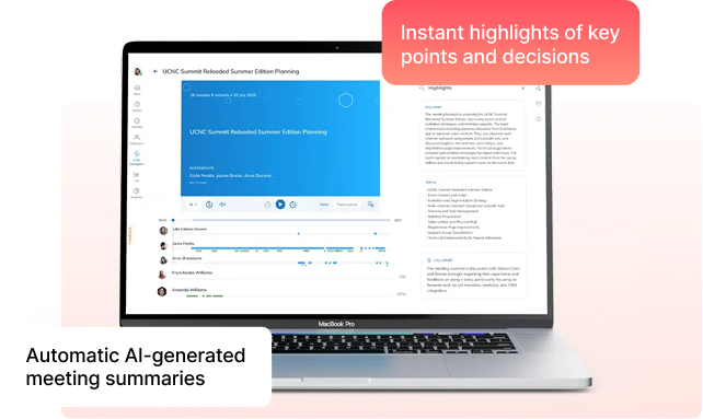 Receive automated call and meeting summaries highlighting essential points and action items, enabling your team to catch up quickly and jump in effortlessly.
